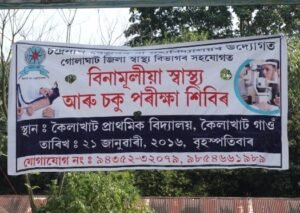 Health Camp On 21st January 2016 March 19, 2021 admin On 21st January 2016 a “Health and Eye check up Camp” was organized at Kailakhat Primary School, Kailakhat where about 100 patients were treated In the camp and the Cataract patients were helped in doing operation at Jorhat Medical College Hospital.